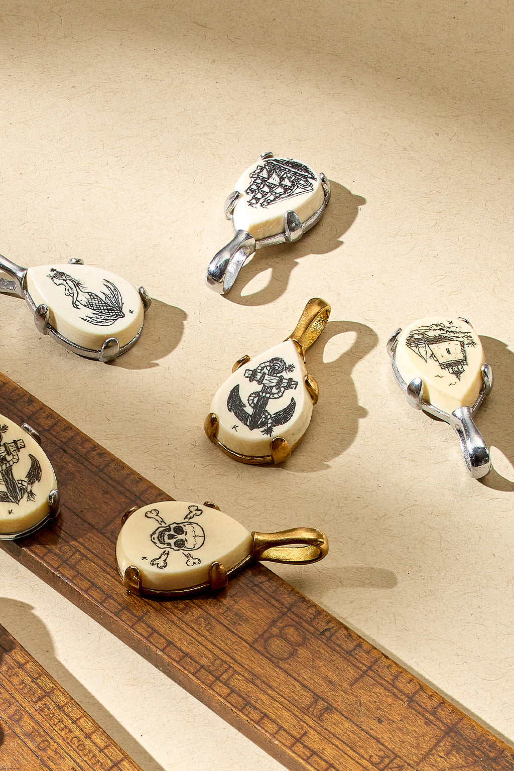 For this collaboration, we partnered with Brian Kiracofe, Newport’s legendary scrimshander. His hands hold the patience of generations. With just a scribe, a blade, and ink, he cut five exclusive designs, line by line. Up close, it’s mesmerizing: the swell of a wave curling beneath the ship’s sails, the twists of rope on the anchor, the tiny scales of a mermaid’s tail. From across the room, it’s like holding a memory itself.