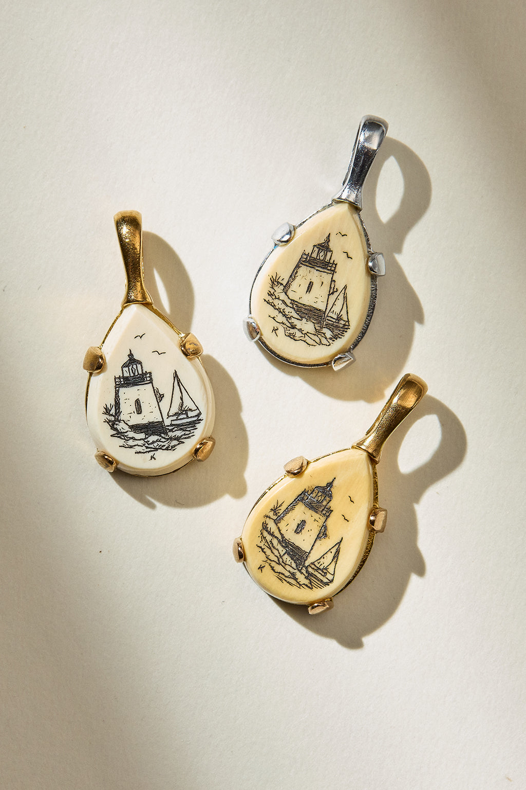 Scrimshaw is storytelling carved in bone, one of New England’s oldest folk arts, born on the decks of whaling ships. Sailors spent long months at sea etching memories into whale teeth and bone: home, the sea, the faces they missed. The lines were so fine they’d vanish until lamp black was rubbed into the grooves, and suddenly the stories came alive. Every line deliberate. Every detail counts.