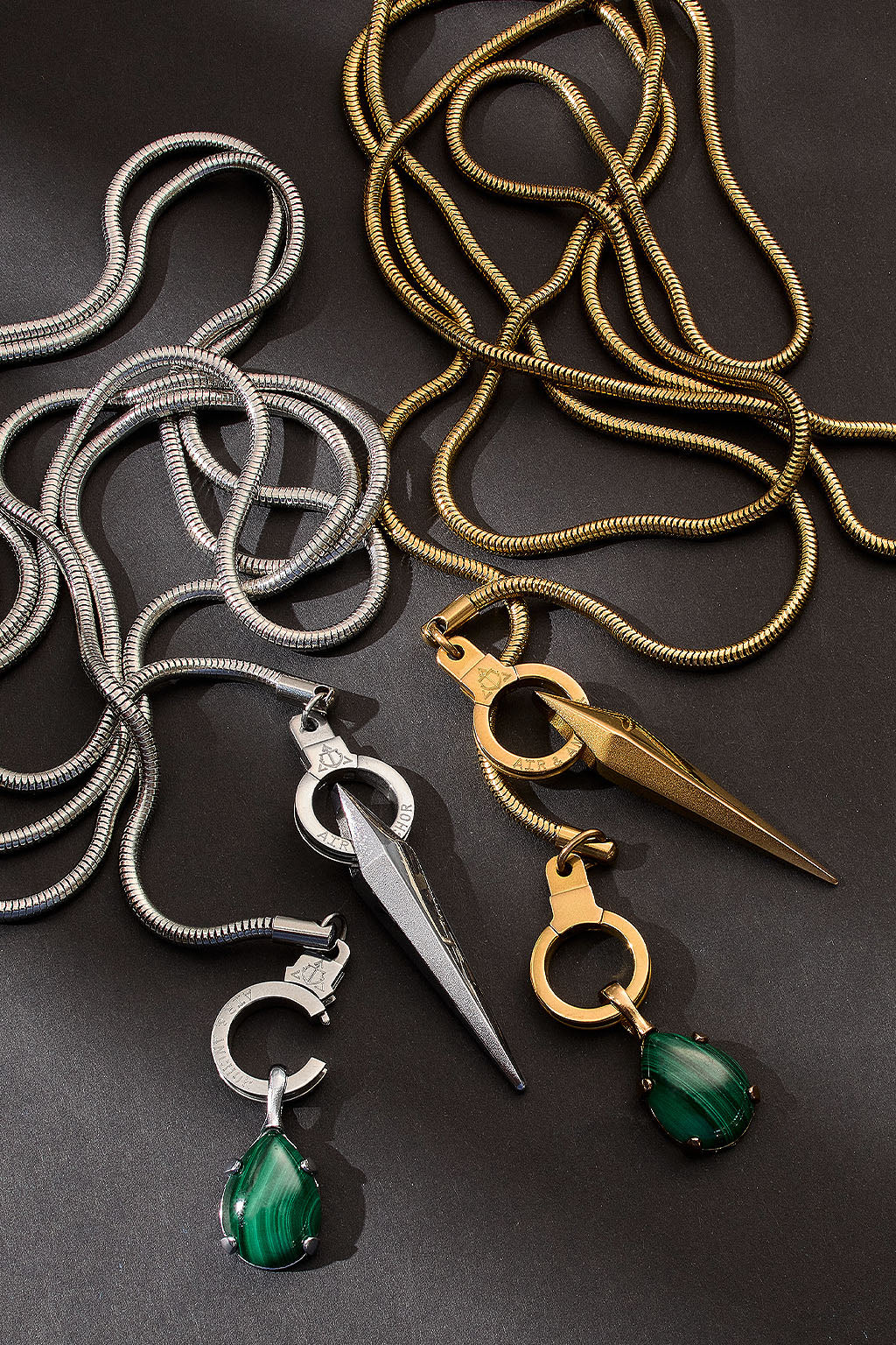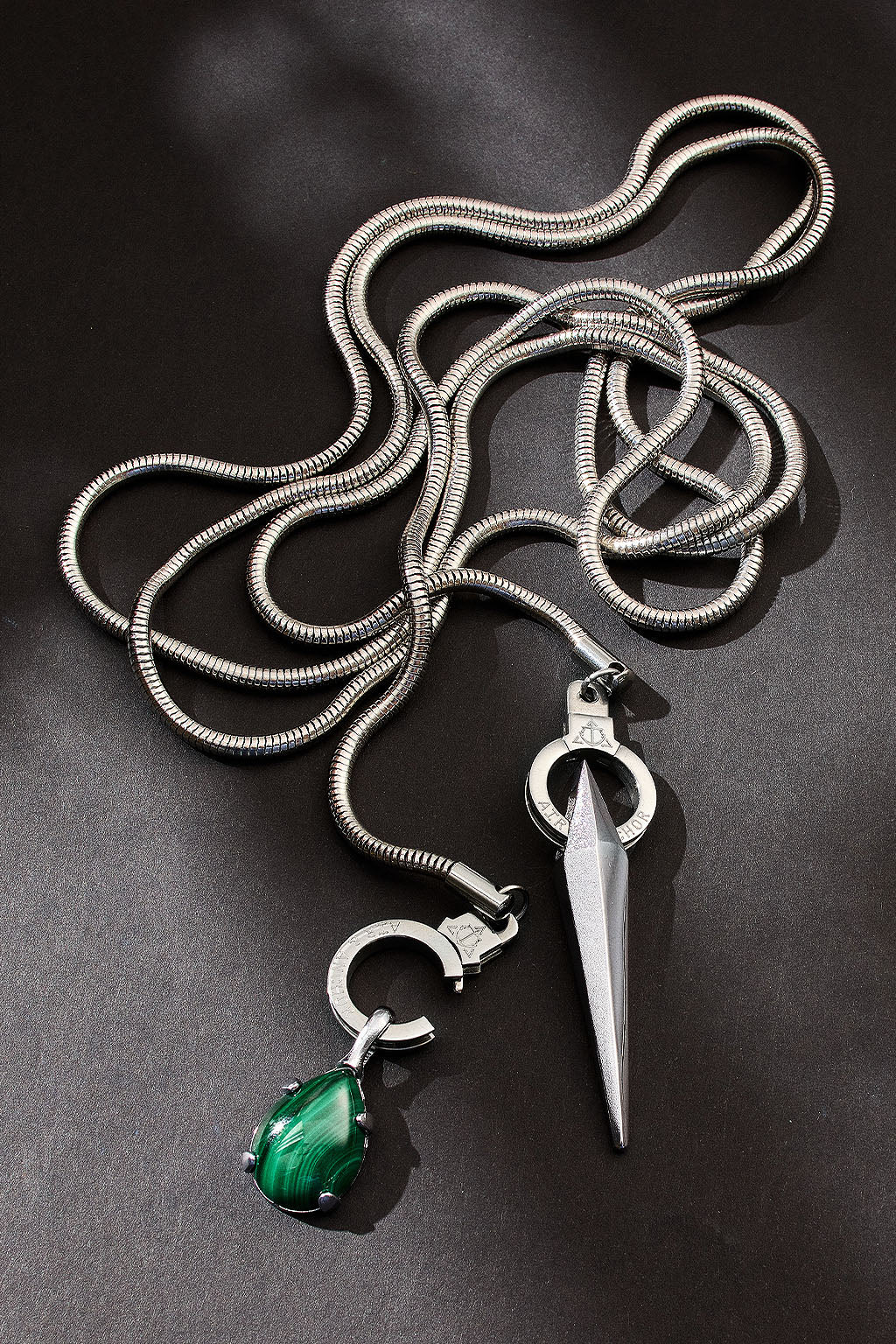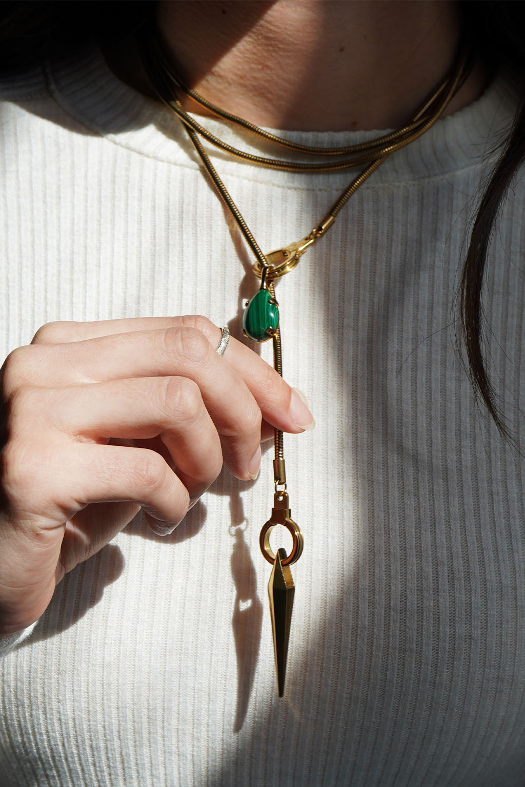 - Stainless steel necklace with brass charms and genuine malachite gemstone.